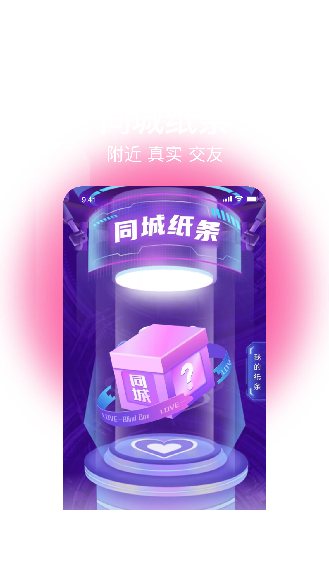”同城纸条“:是一款相互认识的秘密交友,让你早日脱单。你可以放入自己的心里话,也可以抽取一个未知,还你一个惊喜,听从自己内心的声音,快去寻找属于你的那个TA。